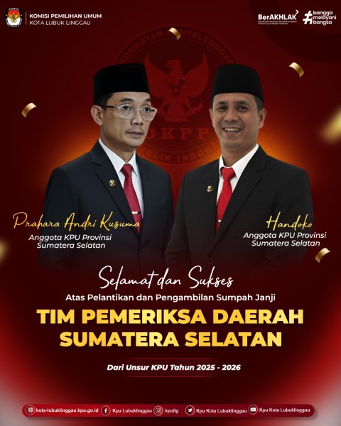 selamat dan sukses atas dilantiknya Bapak Handoko dan Bapak Prahara Andri Kusuma sebagai Tim Pemeriksa Daerah Unsur KPU Provinsi Sumatera Selatan Periode 2025-2026