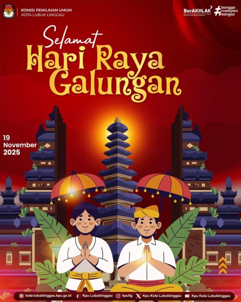 KPU Kota Lubuklinggau menyampaikan ucapan Selamat Hari Raya Galungan Tahun 2025 kepada seluruh umat Hindu di Kota Lubuklinggau dan di seluruh Indonesia. Peringatan Hari Raya Galungan menjadi momentum untuk meneguhkan nilai keimanan, memperkuat harmoni kebangsaan, serta mempererat persaudaraan dalam keberagaman.