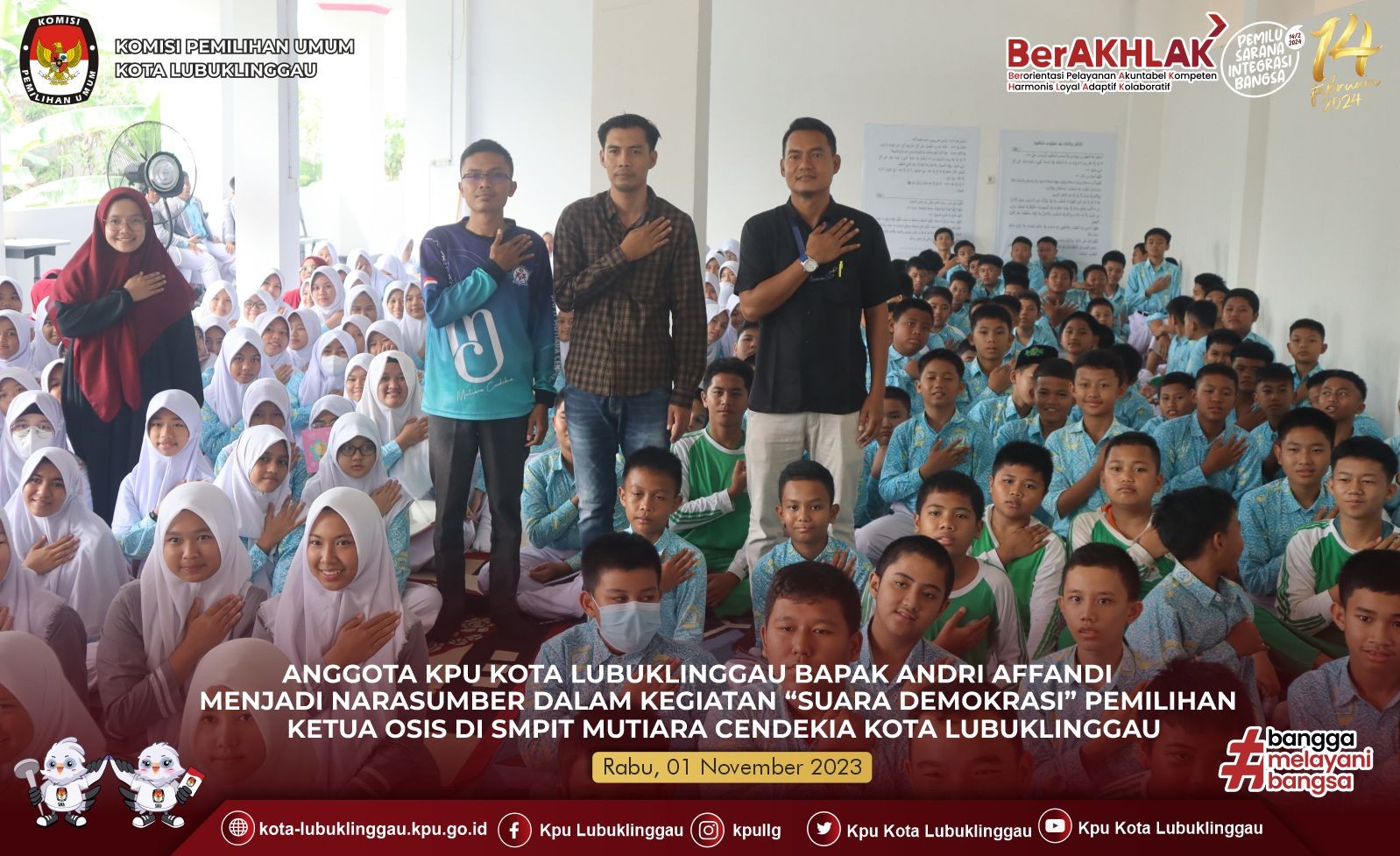 #Temanpemilih, Rabu, 1 November 2023. Anggota KPU Kota Lubuklinggau Bapak Andri Affandi,S.Pd menjadi narasumber Projek Penguatan Profile Pelajar Pancasila "Suara Demokrasi" Pemilihan Ketua OSIS SMPIT Mutiara Cendekia Kota Lubuklinggau. Dalam kegiatan tersebut Anggota KPU Kota Lubuklinggau Andri Affandi mengingatkan pentingnya pemilu sebagai sarana integrasi bangsa dalam memilih pemimpin dalam hal ini adik adik di SMP IT Mutiara Cendekia walaupun belum punya hak pilih untuk memilih di pemilu dengan pemilihan ketua osis yang akan dilaksanakan merupakan pelajaran dalam menghadapi pemilu di pemilihan umum selanjutnya.