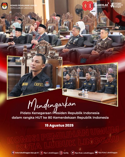 #TemanPemilih, Ketua dan Anggota KPU Kota Lubuk Linggau menghadiri Rapat Paripurna DPRD Kota Lubuk Linggau dengan agenda mendengarkan Pidato Kenegaraan Presiden Republik Indonesia dalam rangka HUT Ke 80 Kemerdekaan RI tahun 2026