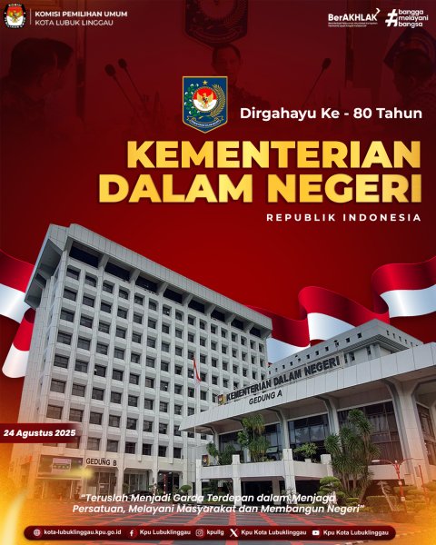 #TemanPemilih, KPU Kota Lubuk Linggau mengucapkan Dirgahayu ke-80 Tahun Kementerian Dalam Negeri Republik Indonesia. Teruslah menjadi garda terdepan dalam menjaga persatuan, melayani masyarakat, dan membangun negeri.