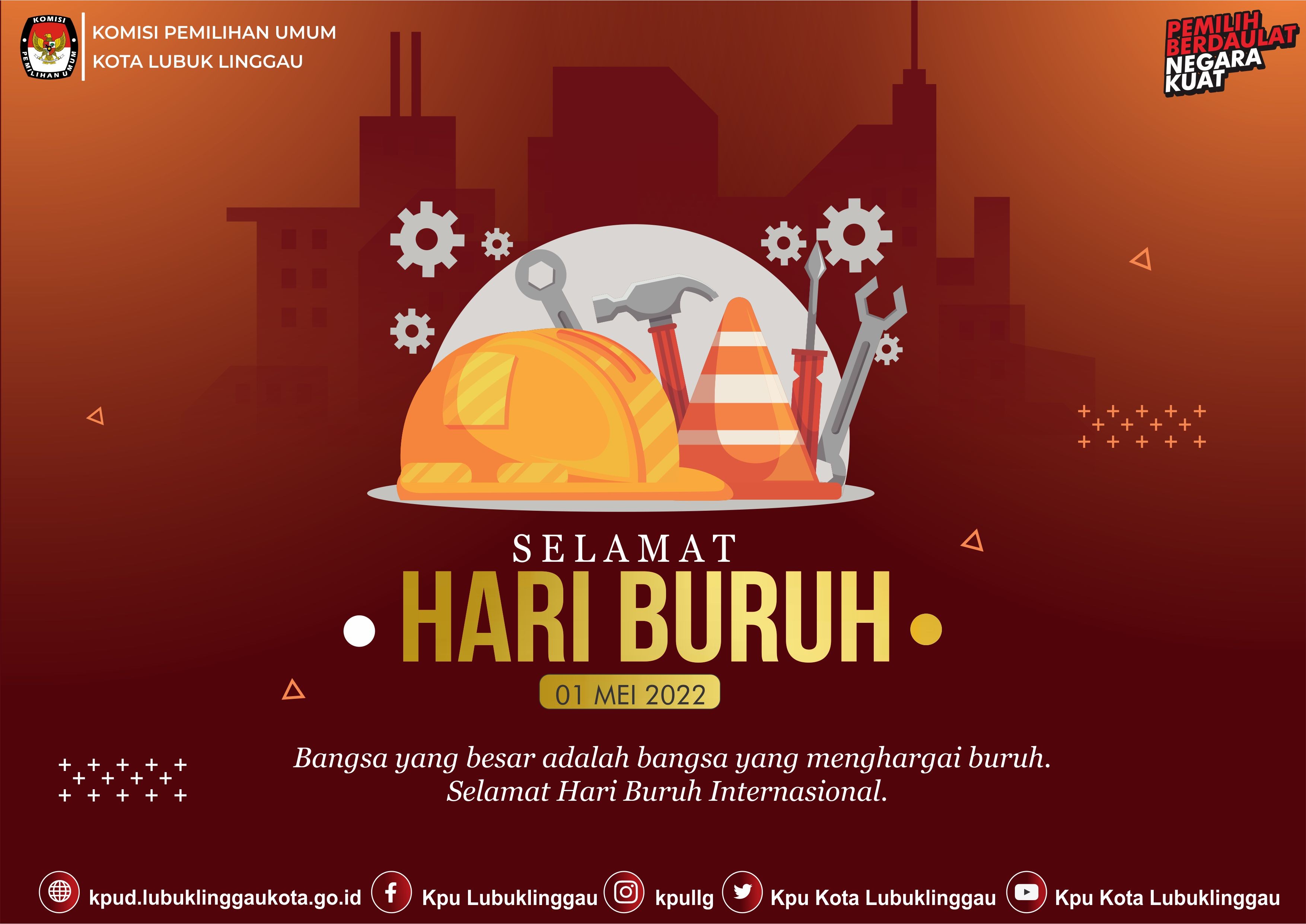 #TemanPemilih, KPU Kota LubukLinggau mengucapkan Selamat Hari Buruh Internasional. "Bangsa yang Besar adalah Bangsa yang Menghargai Buruh.