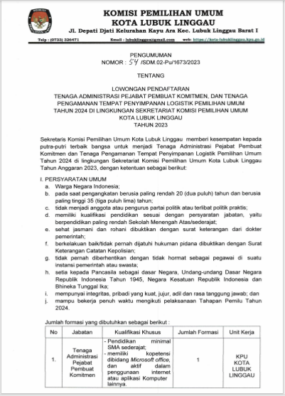 LOWONGAN PENDAFTARAN TENAGA ADMINISTRASI PEJABAT PEMBUAT KOMITMEN, DAN TENAGA PENGAMANAN TEMPAT PENYIMPANAN LOGISTIK PEMILIHAN UMUM TAHUN 2024 DILINGKUNGAN SEKRETARIAT KOMISI PEMILIHAN UMUM KOTA LUBUKLINGGAU.