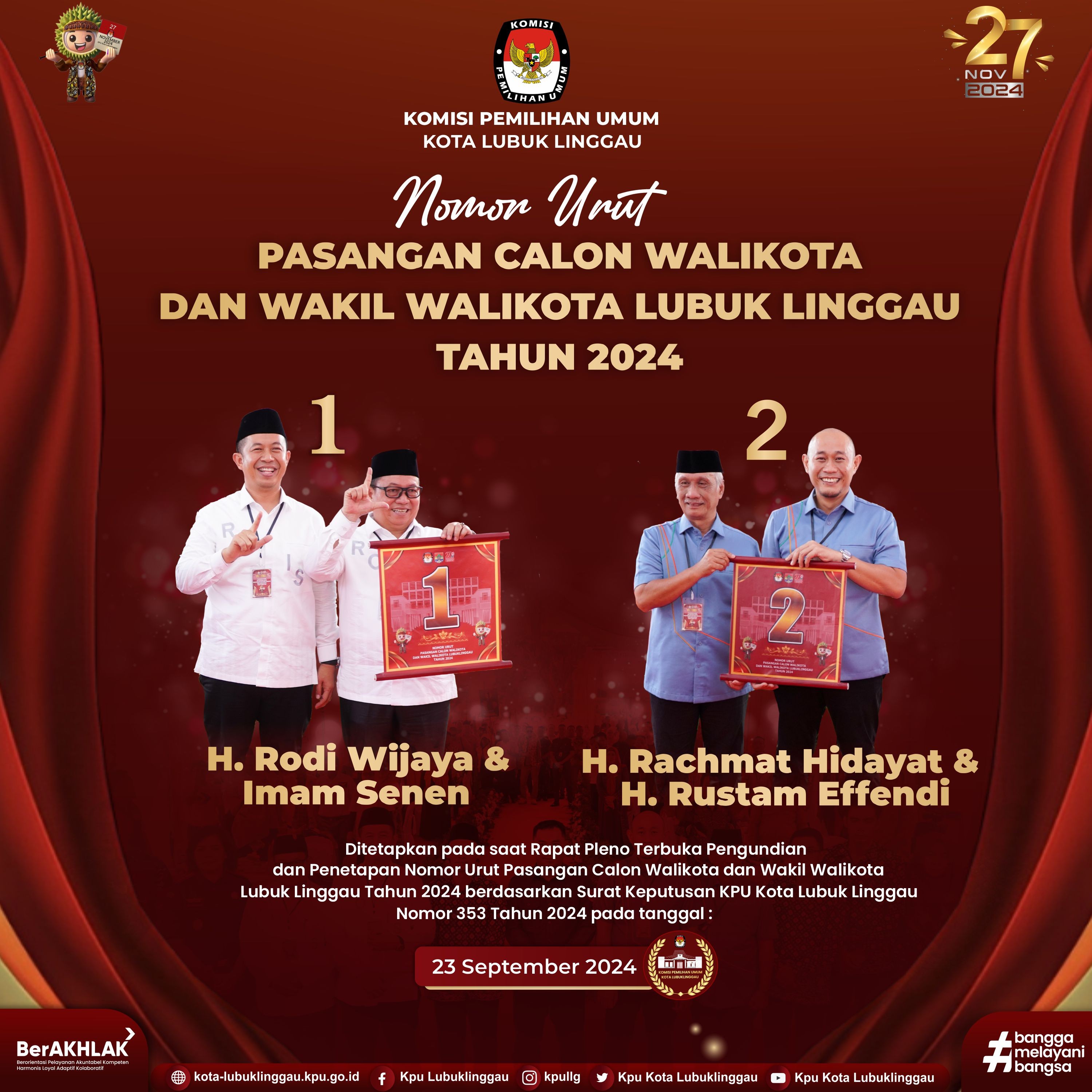 #TemanPemilih, KPU Kota Lubuk Linggau telah melaksanakan Penetapan dan Pengundian Nomor Urut Pasangan Calon Walikota dan Wakil Walikota Lubuk Linggau Tahun 2024 pada Senin (23/9/2024) dengan hasil Pasangan Calon Walikota dan Wakil Walikota Lubuk Linggau atas nama H. RODI WIJAYA dan IMAM SENEN mendapatkan nomor urut 1 (satu) dan Pasangan Calon Walikota dan Wakil Walikota Lubuk Linggau atas nama H. RACHMAT HIDAYAT dan H. RIDWAN EFFENDI mendapatkan nomor urut 2 (dua).