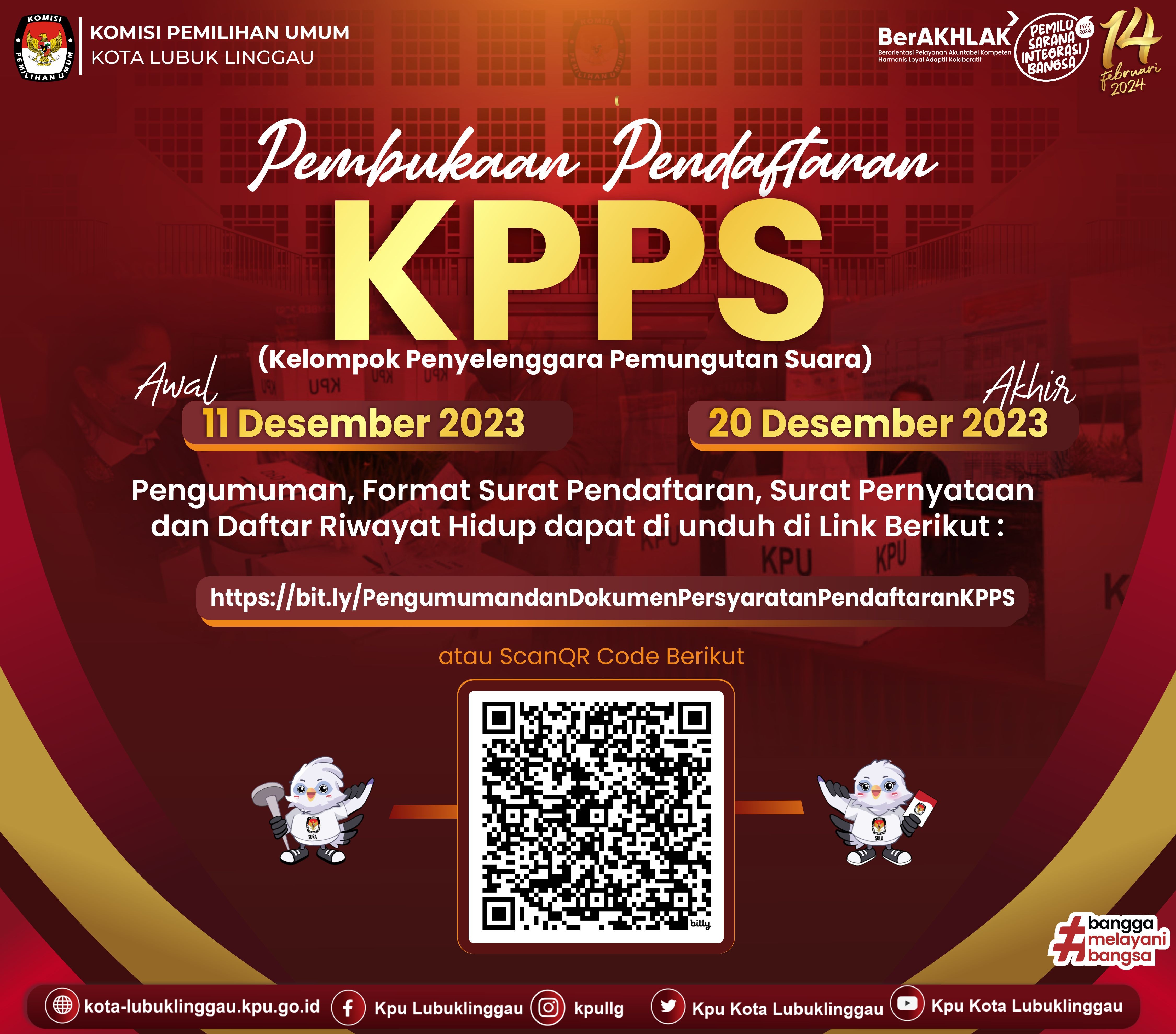 #Temanpemilih, KPU Kota Lubuklinggau membuka pendaftaran KPPS (Kelompok Penyelenggara Pemungutan Suara) dimulai dari tgl 11 Desember 2023 - 20 Desember 2023. surat Pendaftaran dan Kelengkapan dokumen disampaikan kepada PPS pada Kelurahan/Desa masing masing terlampir di Surat Pengumuman alamat dan No Kontak Panitia Pemungutan Suara.
