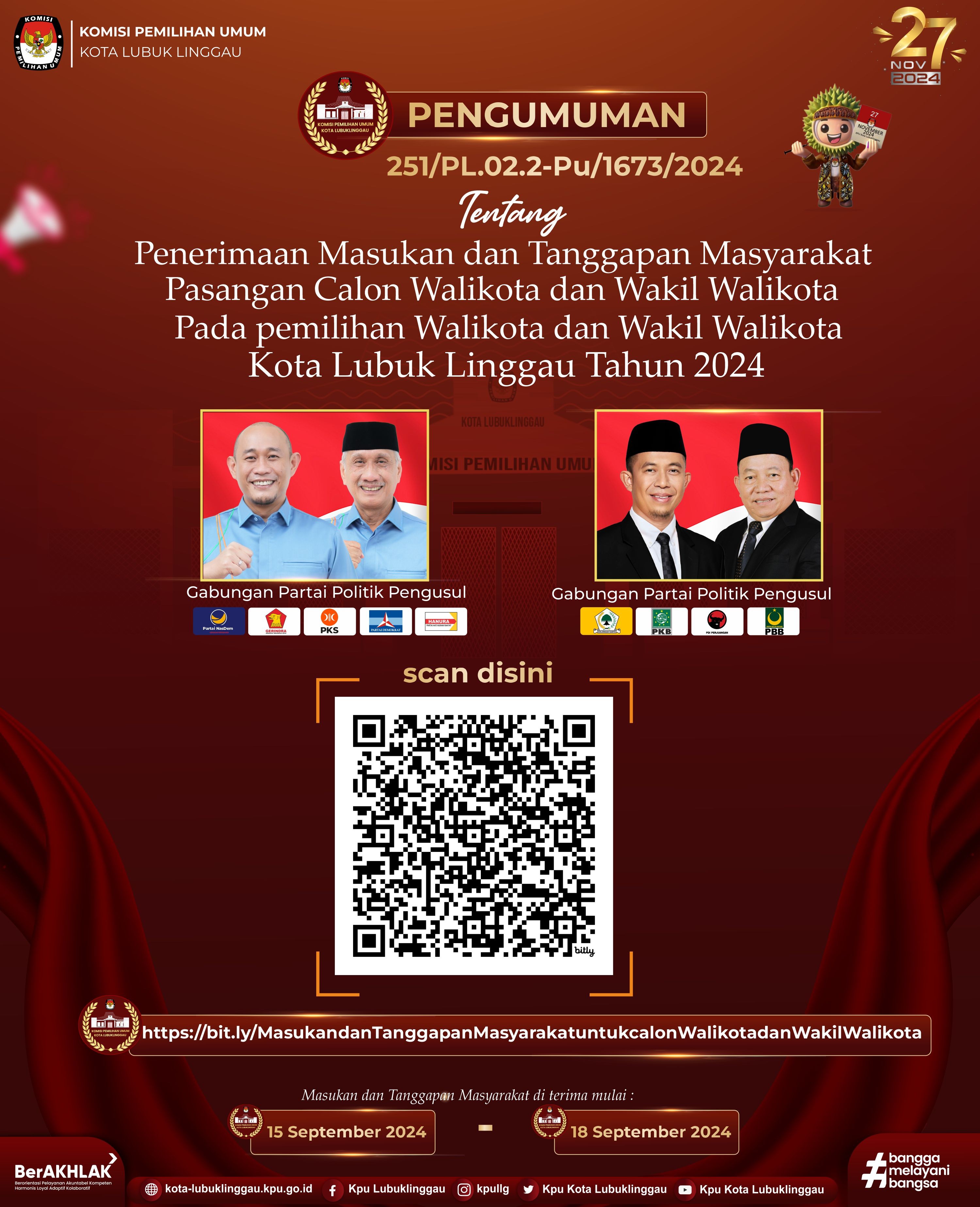 #TemanPemilih, Pengumuman KPU Kota Lubuk Linggau No 251/PL.02.2-Pu/1673/2024 tentang Penerimaan Masukan dan Tanggapan Masyarakat terhadap Hasil Penelitian Administrasi Pasangan Calon Walikota dan Wakil Walikota Pada Pemilihan Walikota dan Wakil Walikota Kota Lubuk Linggau Tahun 2024.