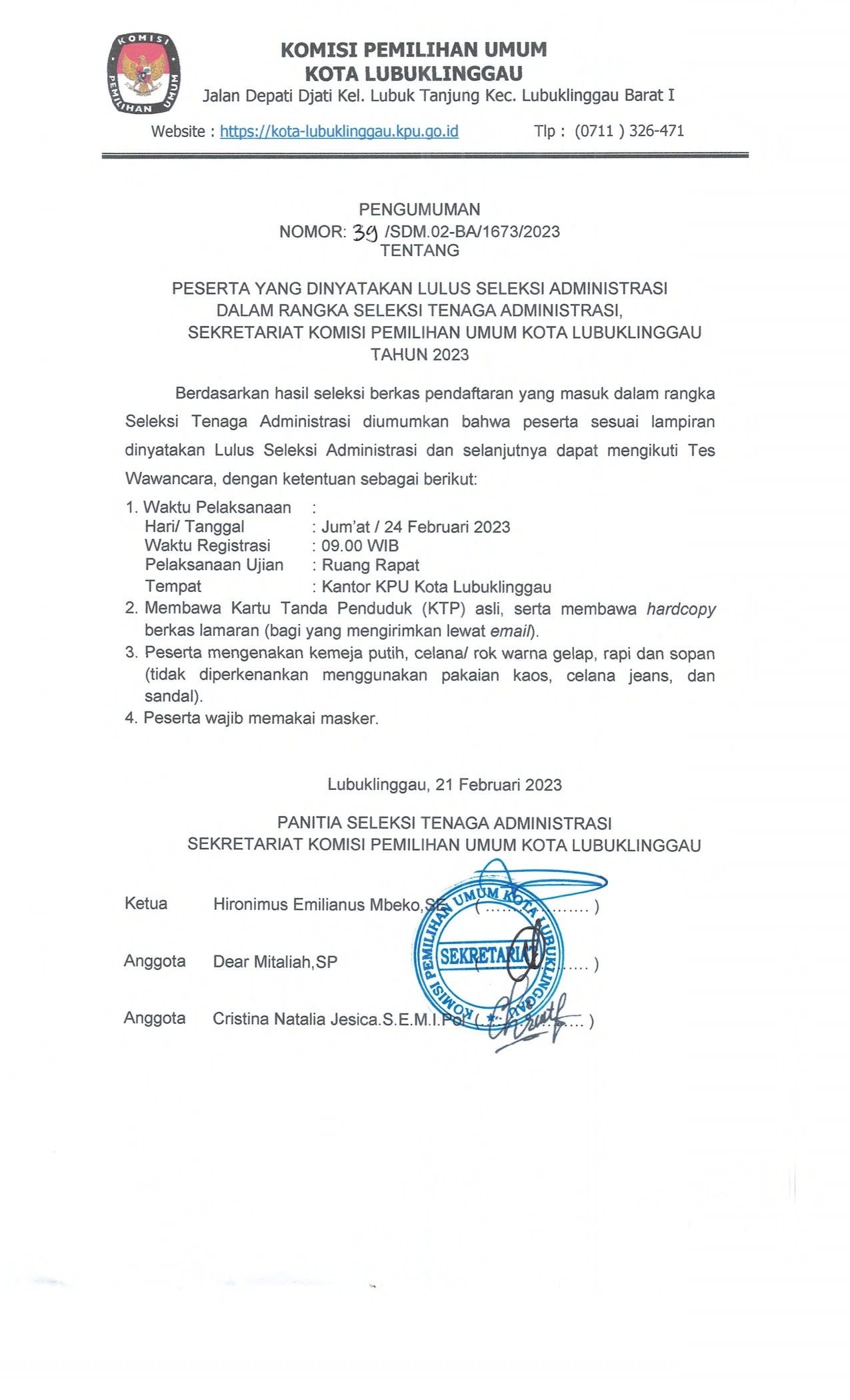 Pengumuman Peserta Lulus Seleksi Administrasi PPNPN Administrasi KPU Kota Lubuklinggau