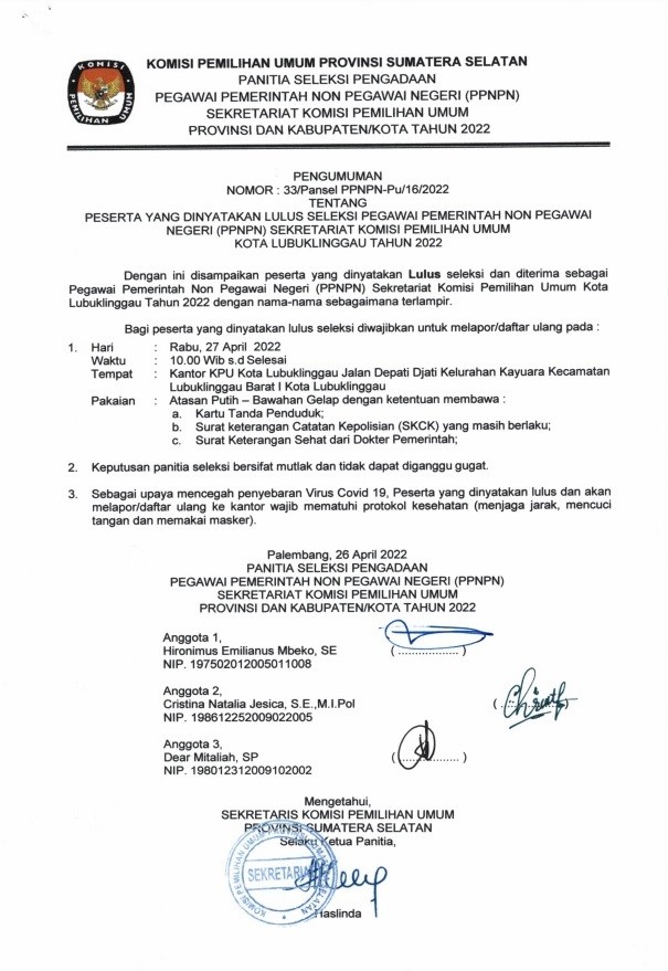 PENGUMUMAN PPNPN KPU KOTA LUBUKLINGGAU 2022