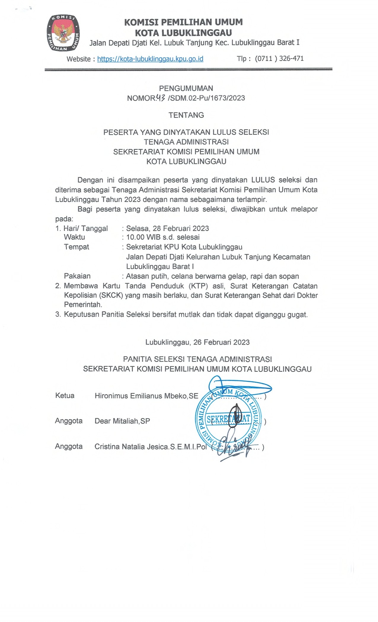 PESERTA YANG DINYATAKAN LULUS SELEKSI TENAGA ADMINISTRASI SEKRETARIAT KOMISI PEMILIHAN UMUM KOTA LUBUKLINGGAU
