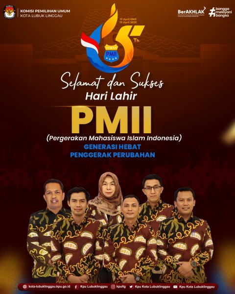 #TemanPemilih, KPU Kota Lubuk Linggau Mengucapkan Selamat dan Sukses Hari Lahir PMII (Pergerakan Mahasiswa Islam Indonesia) ke 65 Tahun.